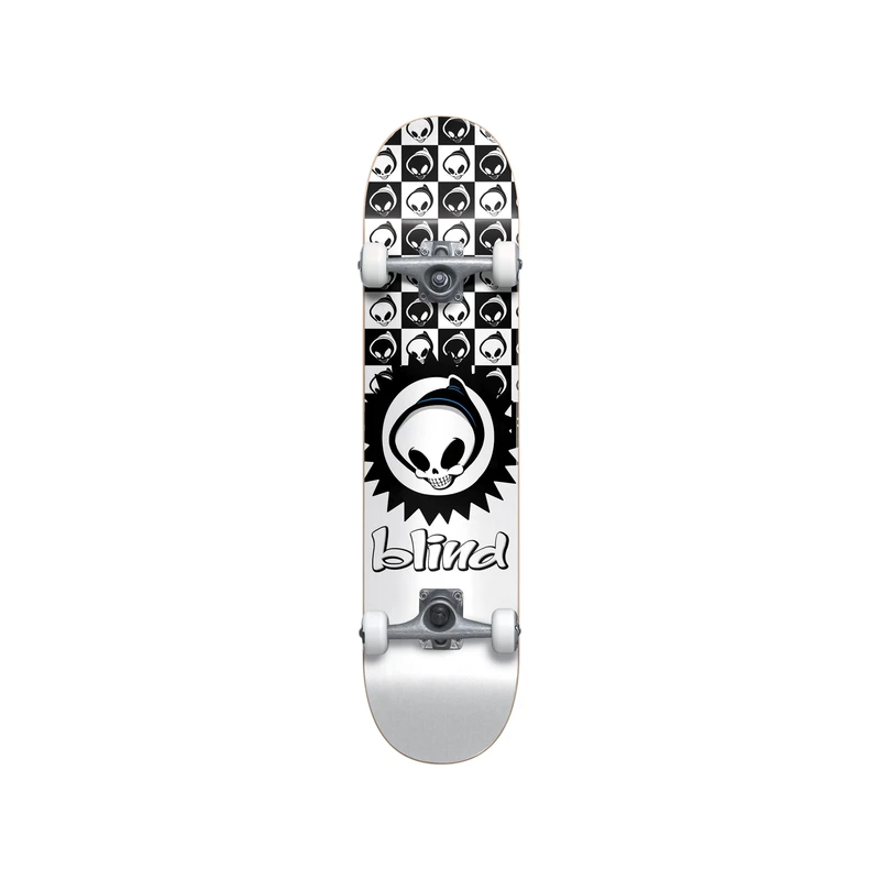 Skateboard complet BLIND Checkered Reaper Soft White en 7.375″, un skate polyvalent aux roues souples idéal pour les petits qui veulent débuter en street, bowl ou park.