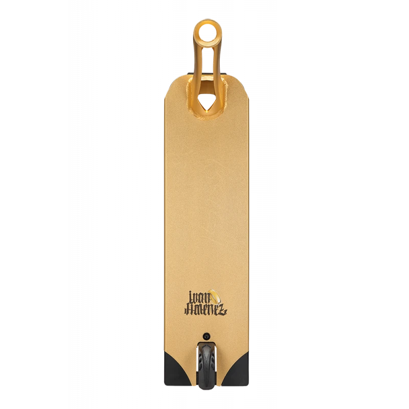 Son deck est recouvert de la couleur anodisée « King Gold », enveloppé dans son graphique personnalisé. Le graphique a plusieurs significations pour Ivan : les fleurs en noir et blanc représentent la dualité, le serpent est une référence aux sept chakras, les vagues font référence au célèbre spot de Barcelone où il a appris à rider et la bague est ce qu’il porte, un cadeau de son grand-père qu’il embrasse après chaque gros trick. Il a également un objet secret dans le dessin pour quelqu’un d’important dans sa vie, à vous de le découvrir !