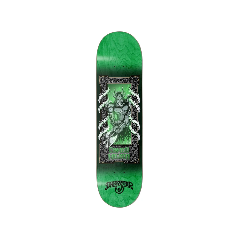 Planche de skateboard DARKSTAR Anthology 2 R7 Cameo Wilson en 8.25″, pro-model du rider Cameo Wilson au design gothique original sur fond vert.