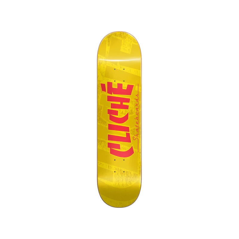 Planche de skateboard Banco RHM Yellow 7.75″ de Cliché Skateboard, au graphisme reprenant la célèbre typographie Thrasher, idéal pour les jeunes riders