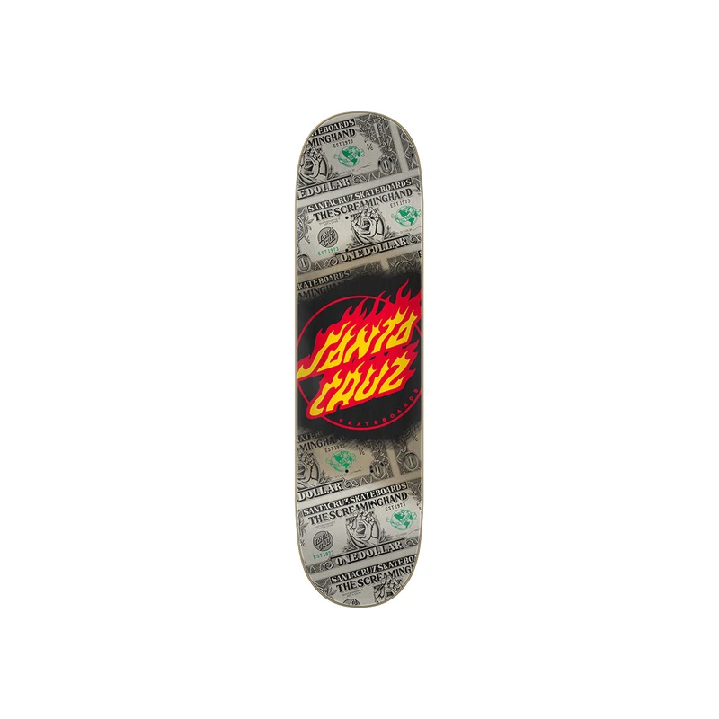 Planche de skateboard SANTA CRUZ Dollar Flame Dot en 8″, avec le logo Santa Cruz enflammé sur un fond de billet de dollar américain Screaming Hand…