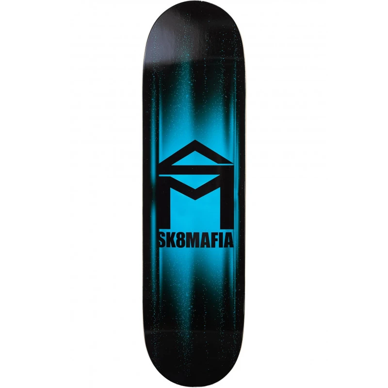 Plateau de skateboard SK8MAFIA Glare Blue en 8.25″, un plateau polyvalent pour street, park ou bowl avec le logo Sk8Mafia sur un fond dégradé bleu/noir