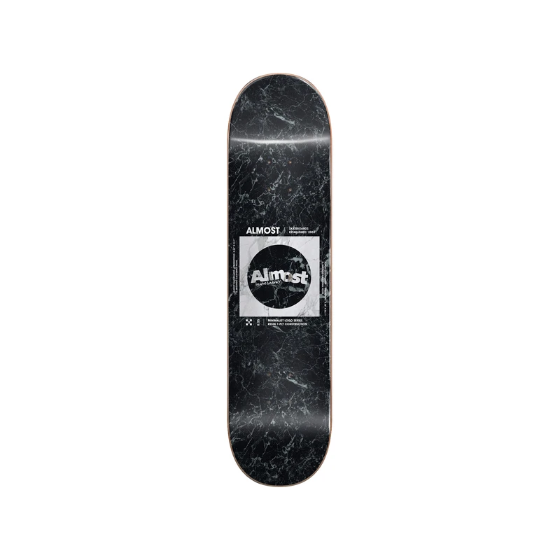 Planche de skateboard ALMOST Minimalist R7 Black White en 8.25″, avec le logo Almost sur fond marbré, pour tous les fans des places et des curbs en marbre.
