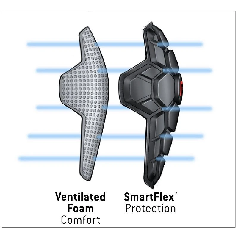 Les coussinets SmartFlex™ absorbent les chocs en s’adaptant à la forme du corps, superposés à une couche de mousse intérieure perforée et douce assurant protection, confort et respirabilité.