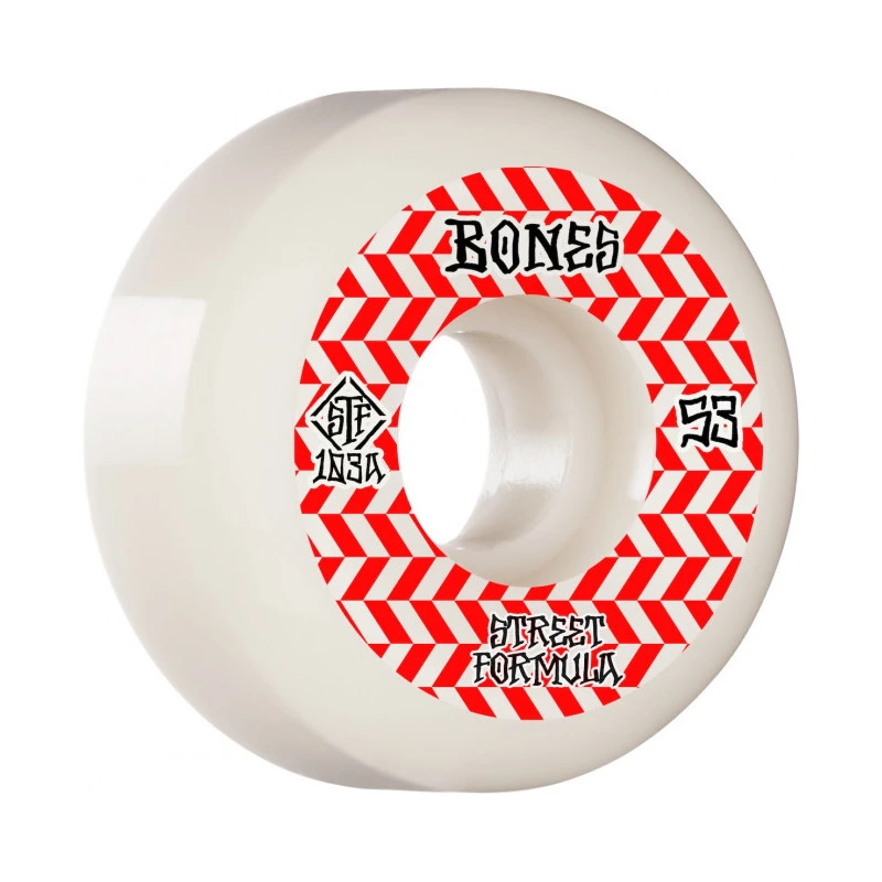 Roues de skateboard Patterns V5 Sidecut 53mm 103A de la marque BONES Wheels. Roues de haute qualité en 53mm et 103A, roues blanche avec un pattern rouge