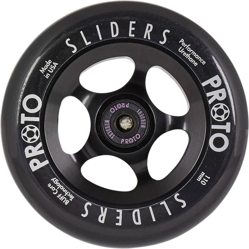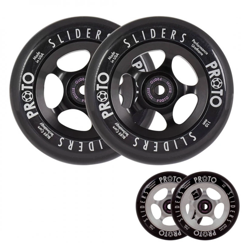 Roues de trottinette freestyle PROTO Slider en 110mm, des roues à rayons plus dures que la version « Gripper » et donc plus résistantes, même lorsqu’elles sont utilisées lors de slides (d’où le nom Slider).