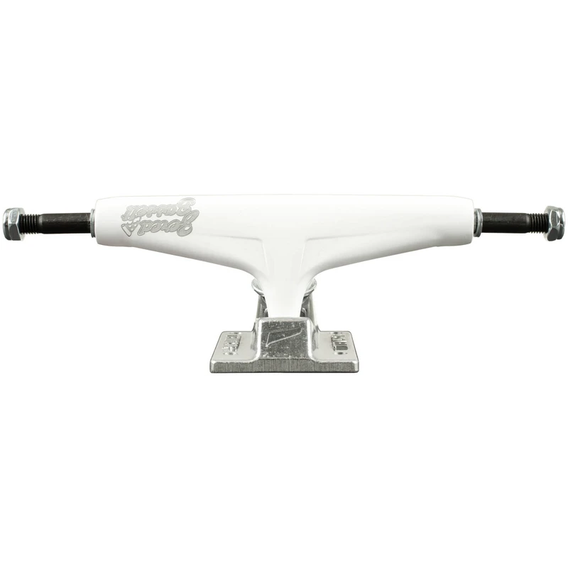 Paire de trucks de skateboard TENSOR Alum Night Shift Zered White en 5.5″, pro-model du rider Zered Basset au design blanc classe et sobre.